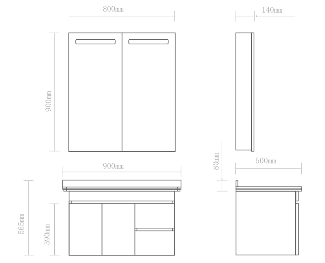 尺寸:化妝鏡 800x900x140 (mm)+ 浴室柜900x500x565 (mm) (可定制)